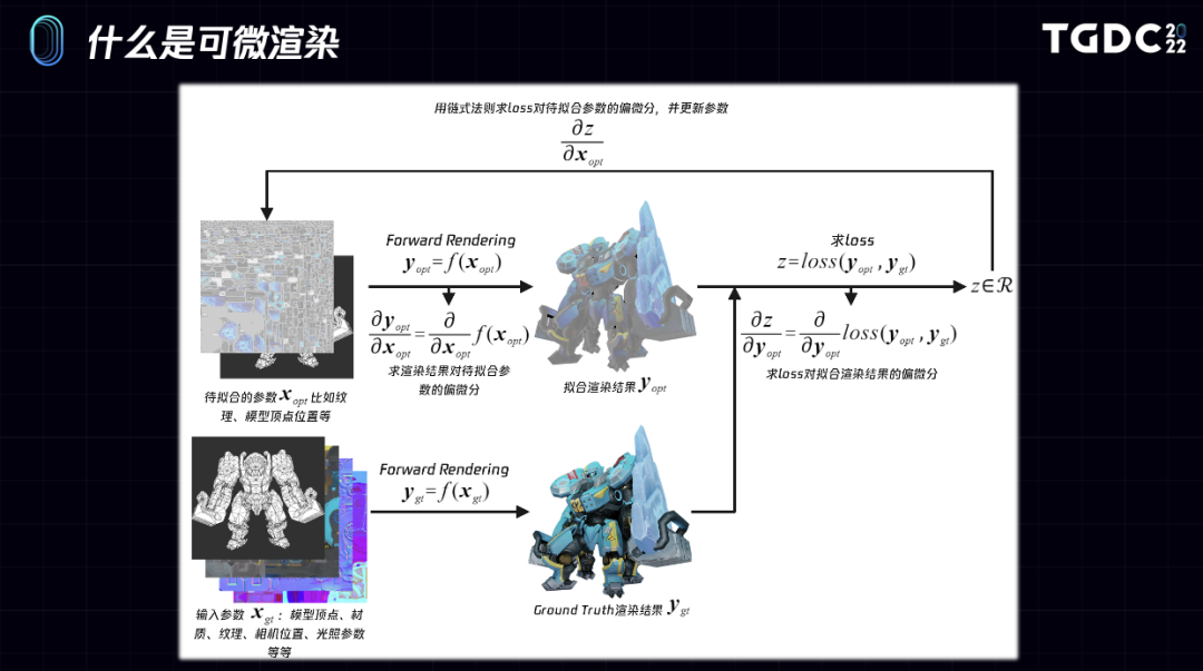 这张图里,上半部分是拟合渲染,下半部分是Ground Truth渲染,输入分别是x_opt和x_gt,opt和gt分别代表optimize和ground truth,它们通过渲染函数f后能分别得到y_opt和y_gt当我们定义了屏幕空间的可微loss函数后,能求得两者的差异z,并对y_opt求得偏导。