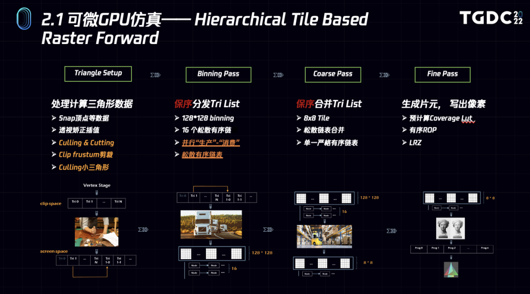 这里简略介绍下Mythal的正向渲染部分的核心Stage,主要包括triangle setup、binning pass、coarse pass和fine pass几个部分。