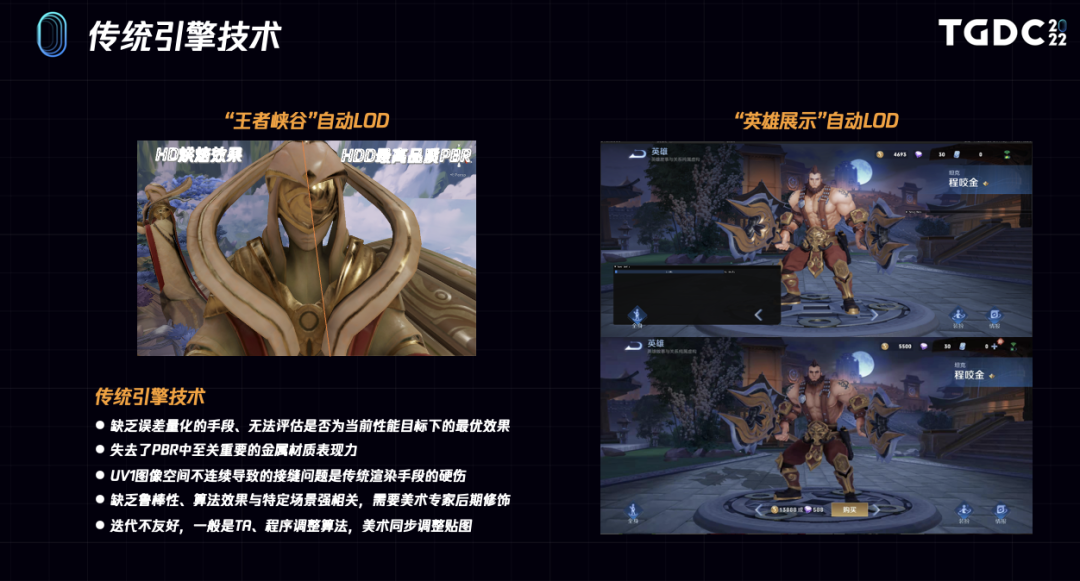 同样的《王者荣耀》局内战斗对渲染的要求更为苛刻,为了同时追求极致的效果以及极致的性能,目前《王者荣耀》局内场景只有最高HDD配置是用的PBR动态渲染,其他几档配置都是用的PBR拟合出来的结果。