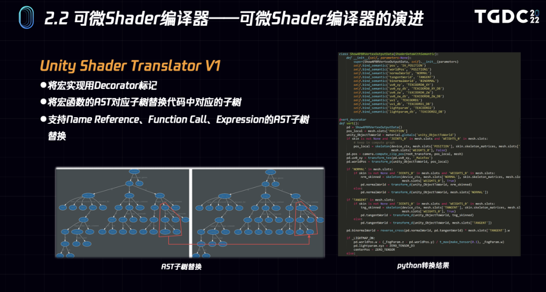 并通过AST子树替换解决类似宏替换之类的问题,可以将绝大部分的unity shader自动翻译成PyTorch Python函数。右图是一个shader部分片段翻译为python代码的例子。