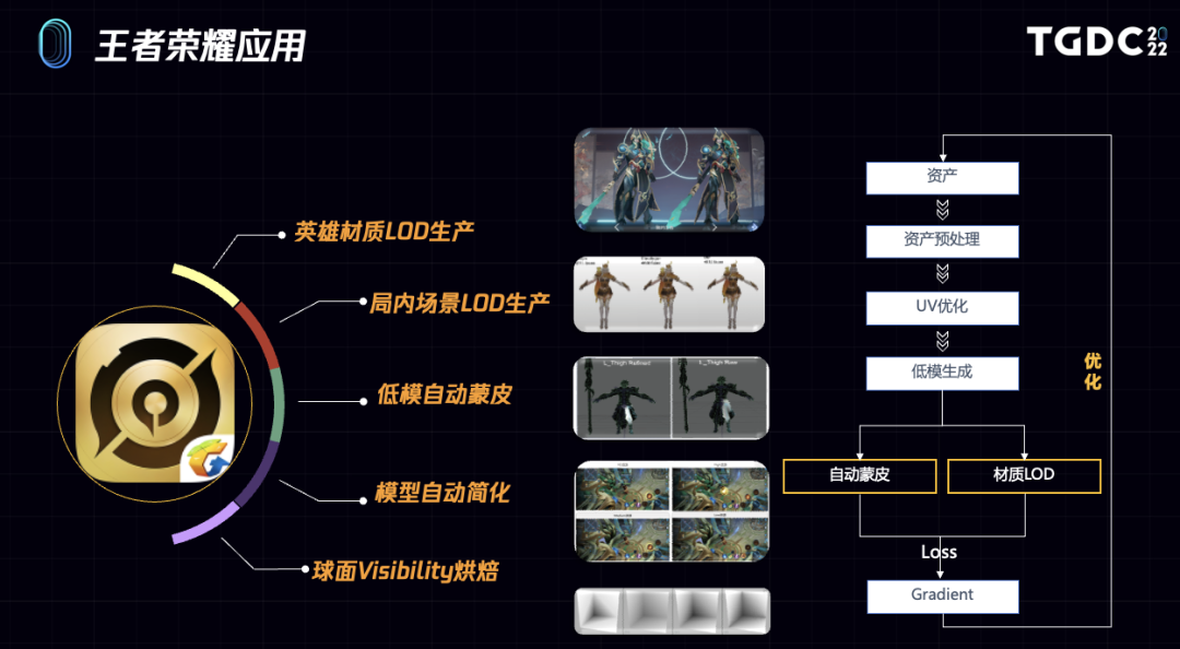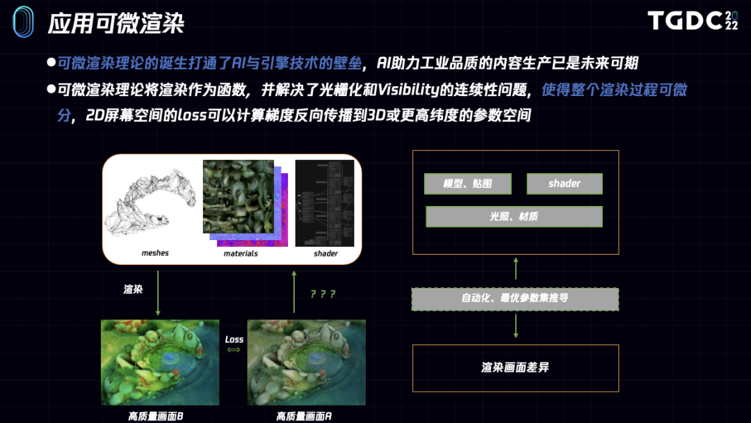 在8月14日由腾讯游戏学堂举办的第六届腾讯游戏开发者大会(Tencent Game Developers Conference ,即 TGDC)上,腾讯互娱天美L1工作室渲染技术专业指导夏飞,带来了《王者荣耀》可微渲染的相关技术分享,介绍了一套基于可微渲染的智能资产辅助生产系统。