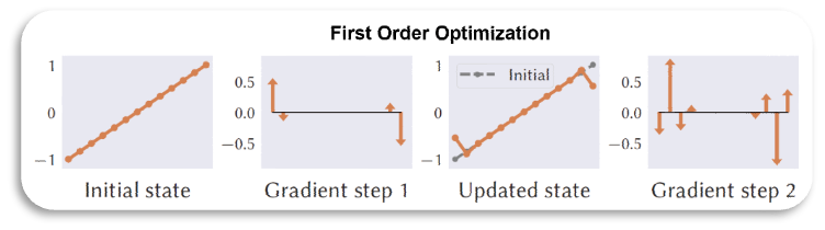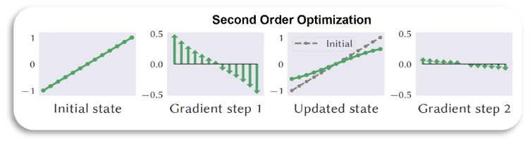 下图是一阶优化和二阶优化的一个梯度传导示意图,二阶梯度能够传递到周围较大邻域的顶点,能够极大提高收敛速度。