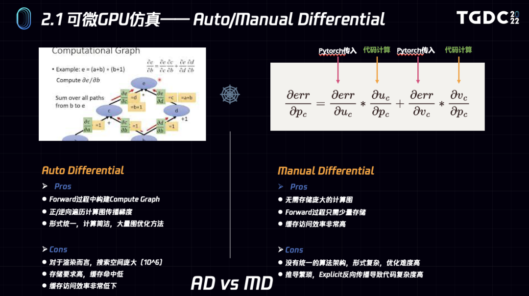 对于Auto Differentiation而言,我们在正向过程中构建compute graph,视输入和输出的维度情况采用正向或逆向遍历,算法统一简洁,非常适合处理比如shader这种多样和复杂的应用,但是对于渲染而言通常参数空间维度很高,存储压力大,带宽和cache missing造成的性能压力是制约这种方法的主要原因。