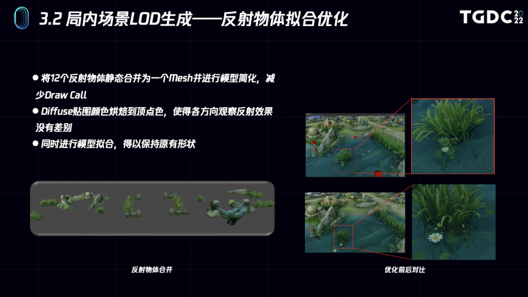 下面例子中对局内水面反射的物体进行了拟合。将12个反射物体拟合成了一个模型,并拟合PBR渲染效果到顶点色。另外需要注意因为反射物体有半透明效果,所以拟合的时候同时需要拟合Mesh的顶点位置,改变Mesh的形状。如何拟合较高质量的Mesh形状会在后面进行说明。