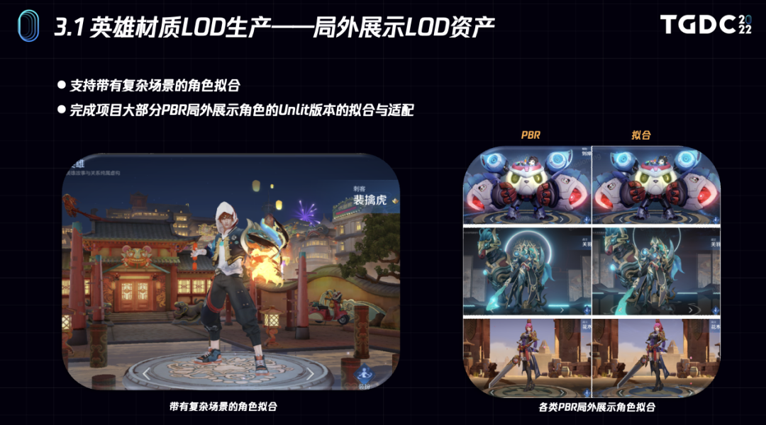 下面是角色展示Lod的真实例子,左边这个展示皮肤中的所有场景和角色都是Unlit渲染的。右边是其他的一些皮肤例子。