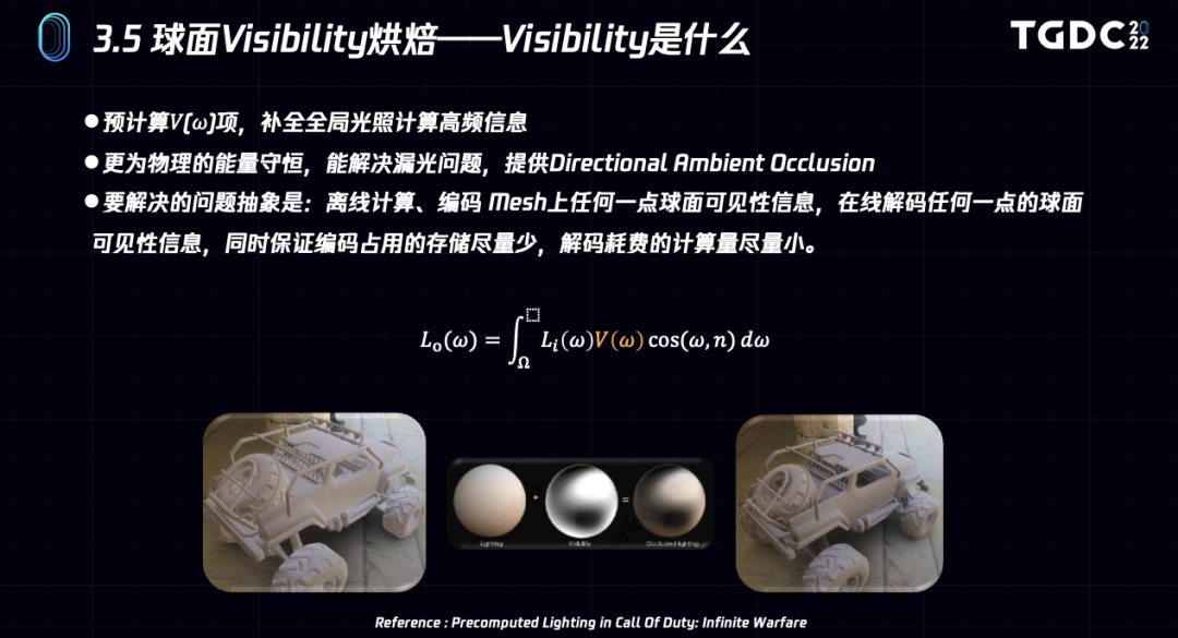 左图是我们在极致优化效率的时候,会把贴图级数据拟合到顶点色上面,比如diffuse、渲染结果,还有后面会讲到的球面visibility信息。Mesh表面的最小二乘法拟合效果依然不能达到最优,玩家应该不太会接受。