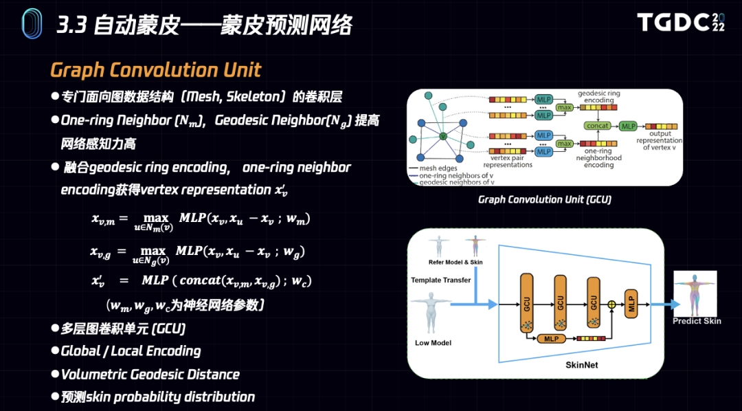 我们的蒙皮网络采用了更适合处理Mesh数据的GCU图卷积层作为基本单元。为了提高网络的预测性能,扩大网络的感知范围,我们对网络结构进行了一定改进。