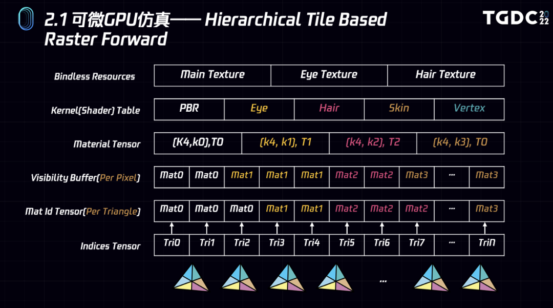 在mytal中为了支持多样化的shader,我们也会生成screen space的visibility buffer,这个屏幕空间的buffer包含了每个像素对应的material ID,以及clip space的UV。同时,我们在渲染器中借鉴了现代渲染API中比较流行的shader table和bindless resource概念,以满足deferred+流程中方便地对材质间接引用以及shader间接调用,这样mythal就可以在正/逆向渲染都能优雅地处理复杂材质。