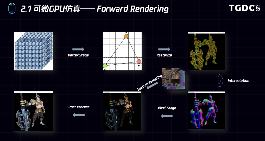 采用这种Hybrid的微分计算方式既可以保证足够的应用通用性,又可以保证很高的性能。为了便于理解整个逆向的过程,这里还是先展示下正向的渲染流程。