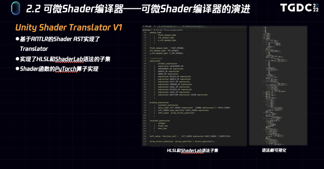在探索过程中,第一版,我们首先使用antlr实现了HLSL和ShaderLab的语法子集,并实现了Unity Shader Lab到Python的代码翻译器。直接将Unity Shader翻译为可微分的Pytorch Python代码。
