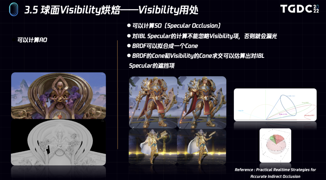 最后将每个顶点的4阶SH拟合成一个Cone数据,用Cone来逼近SH数据,每个顶点最终只需存储4个float即可。有了visibility,runtime除了可以计算AO,还可以计算directional ao,提供物理更为准确的渲染结果。