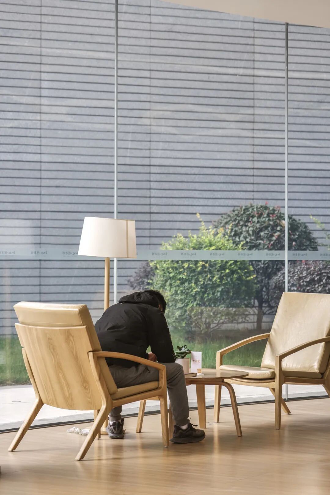 图书馆中央圆环状的瀑布自穹顶飞流直下,阳光穿透屋顶的玻璃与水帘共舞,将自然的声音与光线引入室内。晴好之时,坐在瀑布下方的蒲团上,大自然的白噪音环绕耳边,冥想或阅读,心情无法不妥帖舒适。