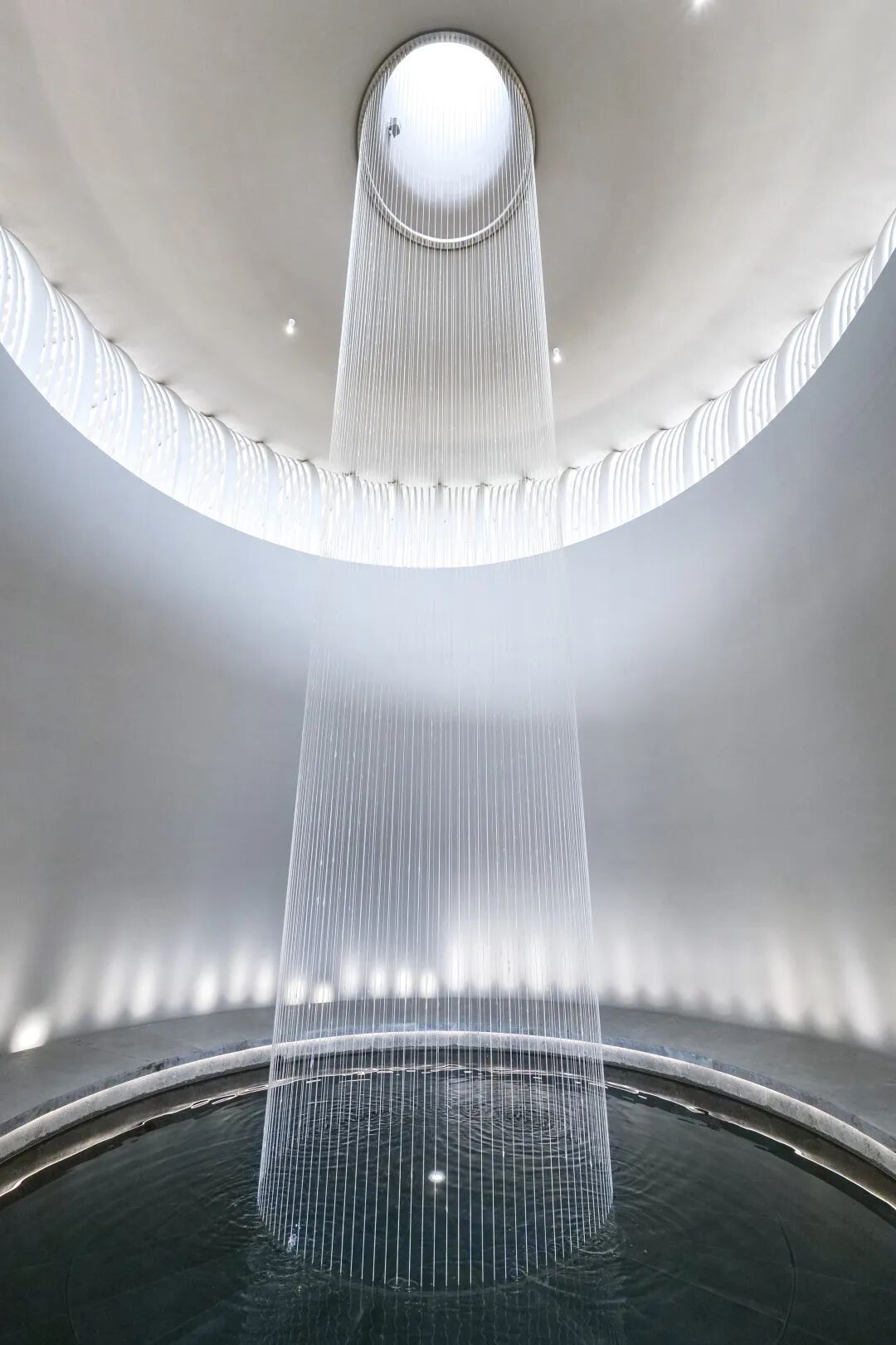 以瀑布为圆心轴线,设计师沿用斐波那契数列的仿生美学,设计了螺旋向上的楼梯式环廊。可沿阶而坐,涵盖艺术人文的书本环绕,共同营造出适宜阅读的静谧氛围。