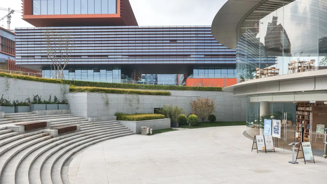 图书馆地下一层入口是开放式下沉广场,通透开敞的半环形空间,形成了一处聚焦且有归属感的场所,也是绝佳的露天表演剧场。这里将不定期举办各类展览、路演、沙龙甚至是音乐会等活动。