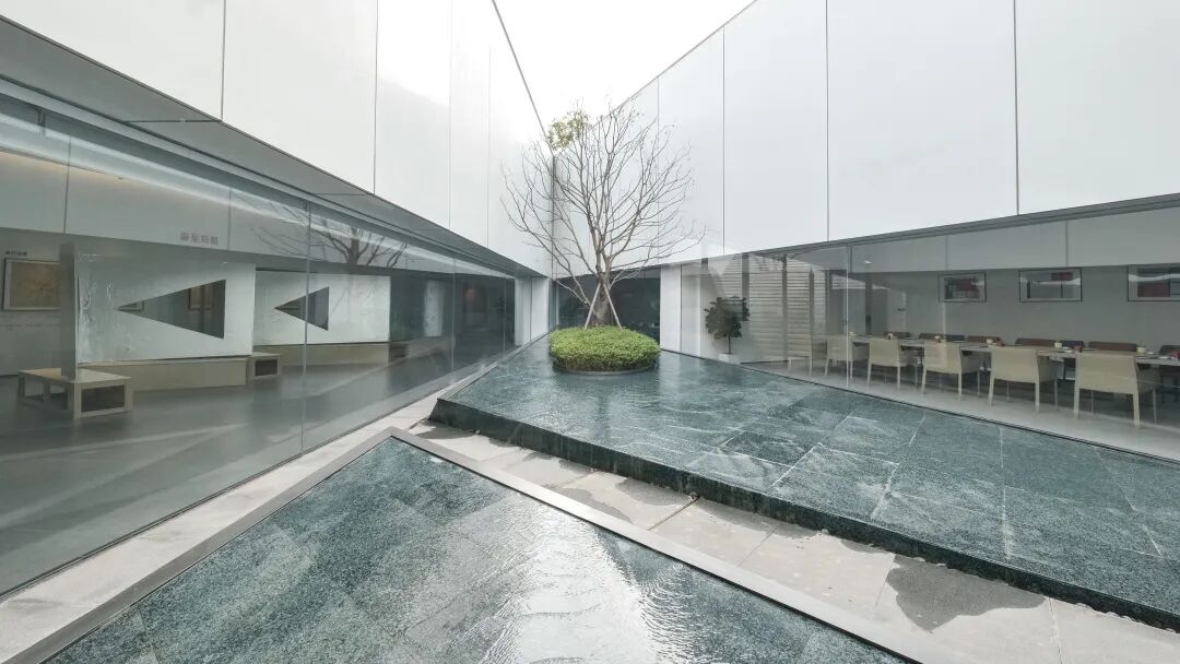 白色沉静的馆内藏纳着别有洞天的生命力,精心设计的庭院景观,通过透明玻璃窗与室内走廊完美融合。绿意盎然的景致,与水波倒影、各种光线混在一起,将人瞬间抽离城市的喧嚣,进入一个宁静安逸的观展氛围。