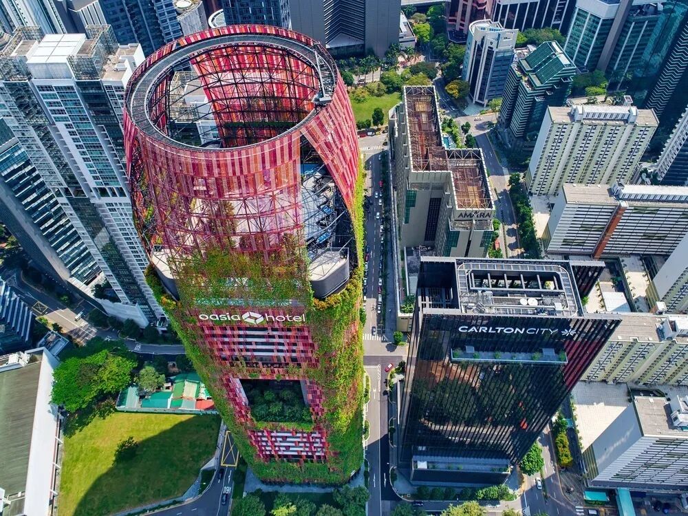 新加坡绿洲酒店的建筑红色铝镀层的网状外壳已经有21种不同种类的攀缘植物逐渐生长茂盛。这些五颜六色的花和绿色的叶子不仅为鸟类和昆虫提供了食物,而且这些植物在对不同情况下的光,风,以及遮荫条件的反应下形成了一幅天然的镶嵌画。
