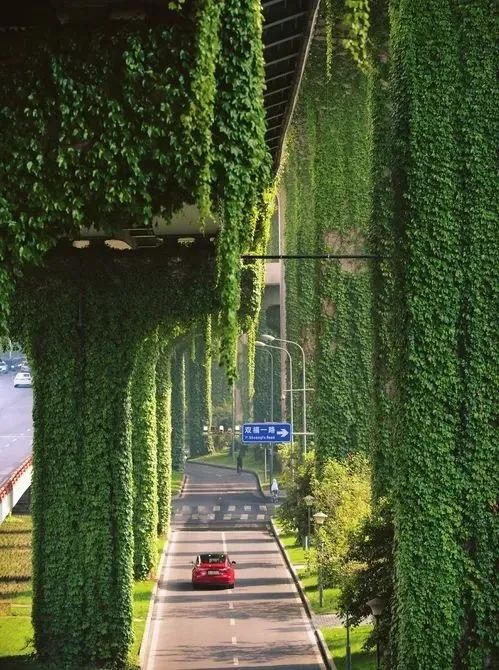 据了解,在成都二环路、三环路下共有4280个桥墩,种植了大约19万平方米的爬山虎,大多数的桥墩“绿化”高度达到了8米以上,夏季正是爬山虎生长最快的季节,这也成为了成都高架桥下别致的一景。