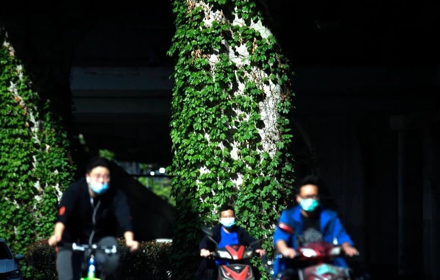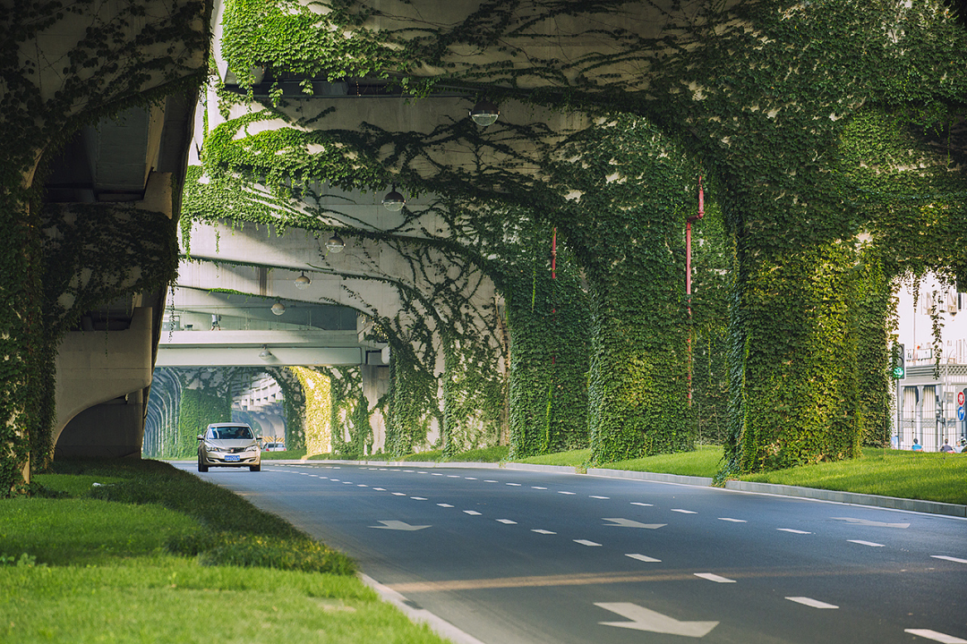 事实上,不只二环路,在三环路以及一些其他的高架桥、立交桥,桥墩上都爬满了郁郁葱葱的爬山虎,看上去就像瀑布一样倾泻而下,给这个炎热的夏季增添了一丝凉爽,也给喧嚣的街道减去一些噪音。
