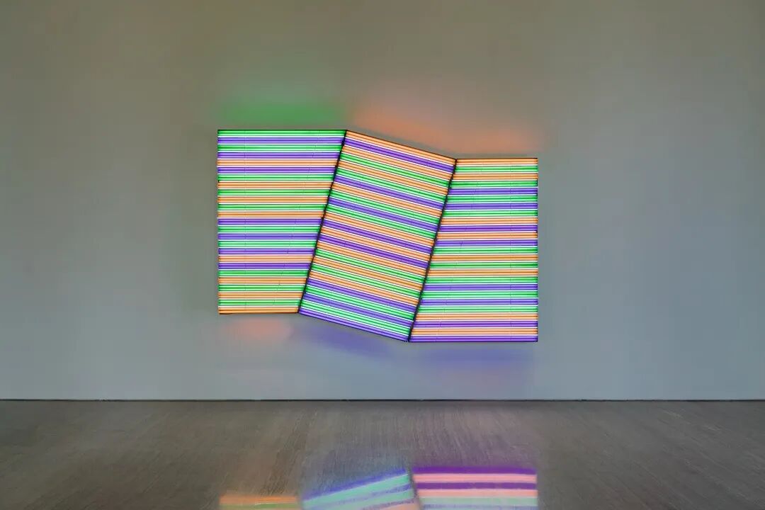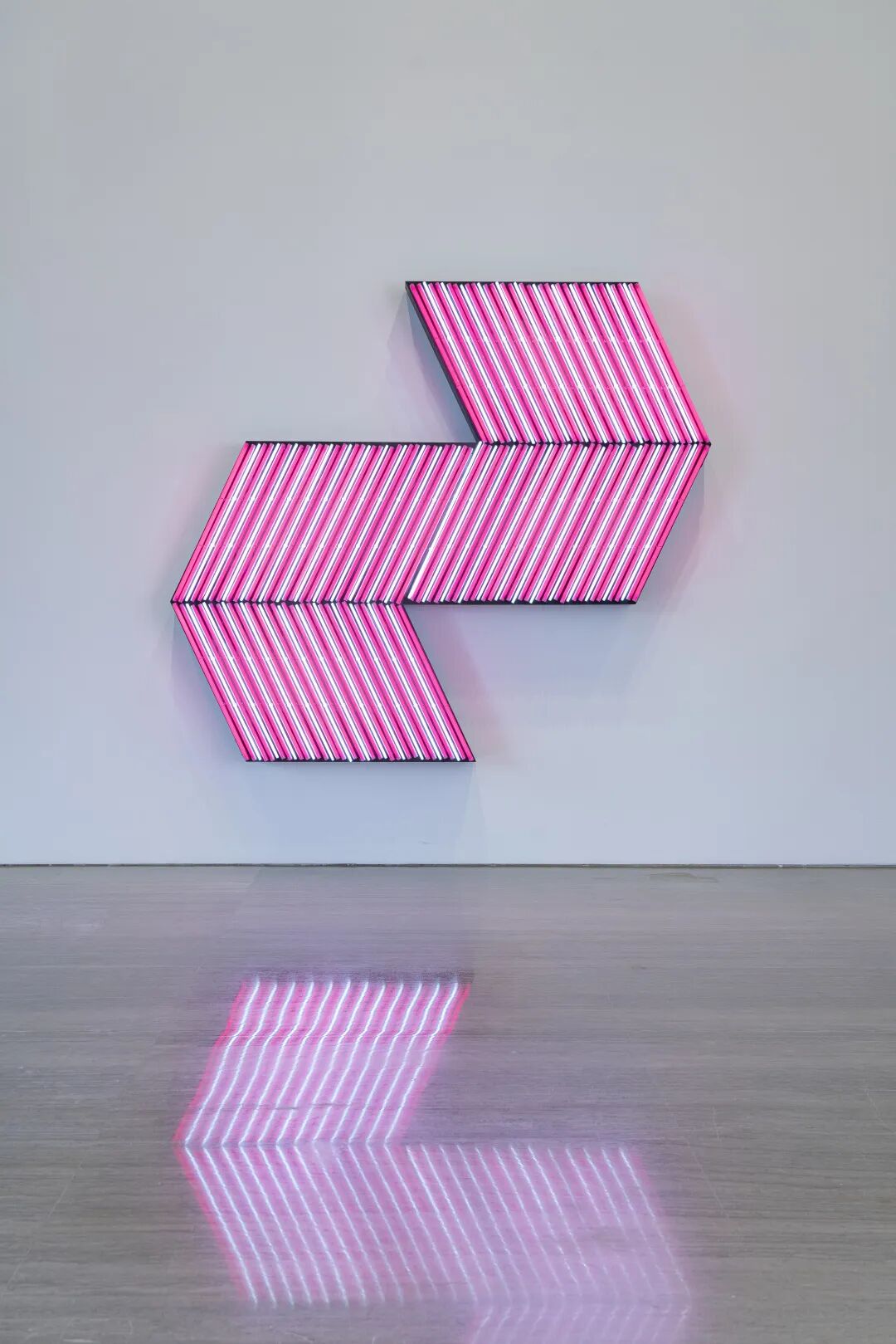 在《Bam三》、《Polk City三》以及《IFFAFA 三》作品中,贝唐·拉维耶致敬了著名抽象艺术家弗兰克·斯特拉,在其早期用色克制、注重画布形状的抽象几何绘画的基础上,通过媒介的转换,用霓虹灯为原本不受个人情感影响的笔触增添了迷人的特殊魅力,在新的历史语境下重新诠释并赋予了作品新的内涵。