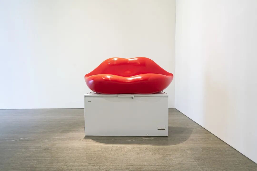 在作品《“红唇”/海尔》中,艺术家将意大利著名设计品牌Gufram设计的标志性家具嘴唇沙发置于中国品牌海尔冰柜之上,通过物品在颜色与材质上,暖与冷、轻与重的反差构成张力,突出组合构造和视觉上的吸引力,以巧妙的叠加消弭了物品自身的商业消费属性,从而对艺术品的定义、创作方式提出了质疑和挑战,同时也对人们之于艺术品的崇拜进行了批判。