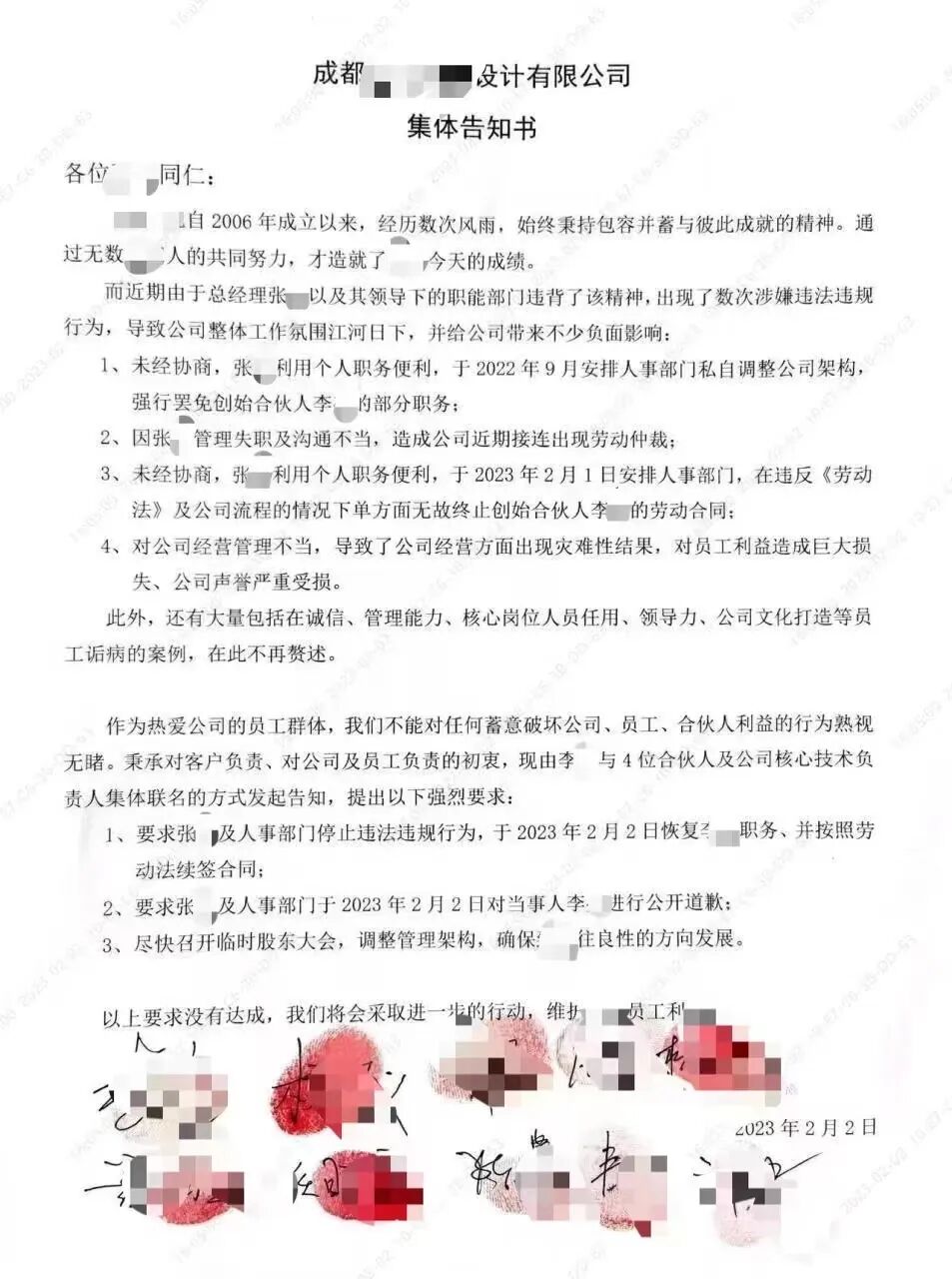 职场圈2023-09-01 成都某院,领导强行任免人员,员工联合抗议 狡兔死,走狗烹;飞鸟尽,良弓藏。 2022年全年,倒闭的设计公司不计其数。还在勉力支撑的小设计公司也大多经历了较大的人事变动和架构调整,以更好适应新时代和新市场的要求。裁员降薪也成为了每个设计师要面临的新常态。 而成都某设计公司的人事调整在常规“降薪裁员“的浪潮当中居然”脱颖而出”,其总经理张某利用职务便利,擅自调整公司架构,强行罢免公司合伙人李某的职务,不当处理多起人事任免导致公司接连发生劳动仲裁事件。 在李某的牵头下,该公司多名员工联合抗议,要求张某及人事部门停止违法行为,并向当事人道歉。同时要求公司召开股东会议,调整管理架构,以确保公司良性发展。 在告知书的最后,大家强调:“以上要求没有达成,我们将会采取进一步的行动,维护员工利益!” 此次事件之所以显得离谱是因为张某居然胆大妄为到试图通过强行罢免合伙人的职务来独揽公司大权,以排挤同盟的方式来争取自己的利益最大化。 市场环境不好是每一个设计人必须面对的事实,利益受损的不止有公司,更是每一个加班熬夜却得不到应得报酬的设计师。此次事件的受害人,因其合伙人的身份,尚能团结核心员工奋起反抗,争取自己的利益。而缺乏话语权的基层员工,他们无法抗拒自己被裁员的命运,至少应该按照法律得到相应的补偿。 本文来自微信公众号“计成”(ID:jicheng-0102)。大作社经授权转载,该文观点仅代表作者本人,大作社平台仅提供信息存储空间服务。 TAGS: 职务裁员设计院 相关文章喜报|祝贺包少茂研究员当选…曝光上海某院欠薪不还的骚套…经济好转后,设计院好像更完…不多说了!TRASHGUN…万科一大批中层员工,集体离…建筑说转行56|享受“下沉…只工作不上班,诚招线上创作…阿尔敏·莱希 –…TOP地产设计院:该滚就滚知识型员工如何激励?是否适…
