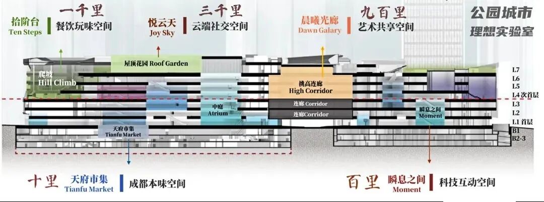 天府大悦城项目设计方案借鉴了日本六木本城市综合体项目经验,引入“峡谷”设计理念,优化建筑退台空间,将退台、屋顶的露天空间打造成为立体的生态花园。