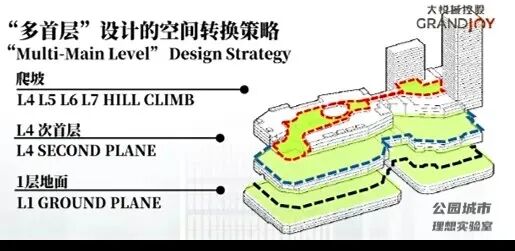 露天空间与商业活动进行有机结合,同时优化垂直交通动线,打造多首层的商业转换空间。