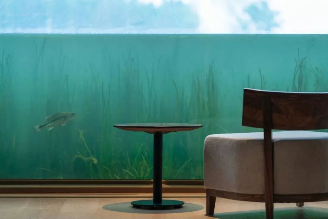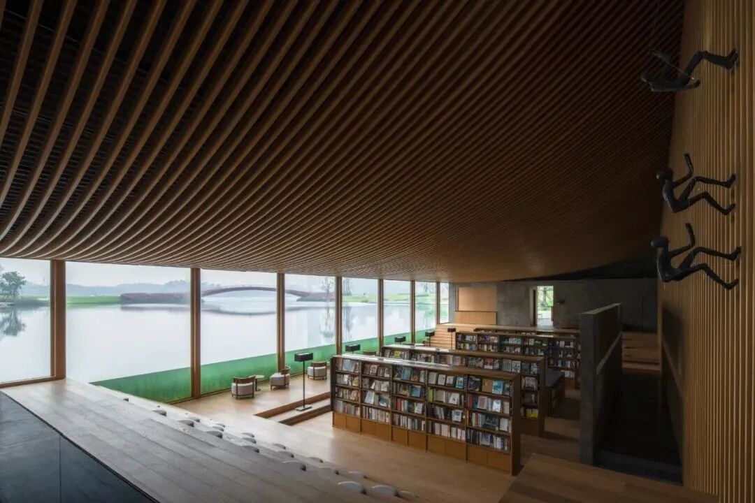 书店临水的阅读区,人的视线与水平面平行,能看到湖中的水草与鱼虾,仿若置身水下。