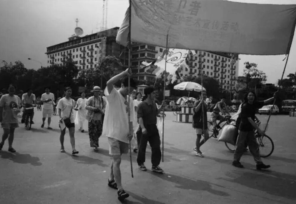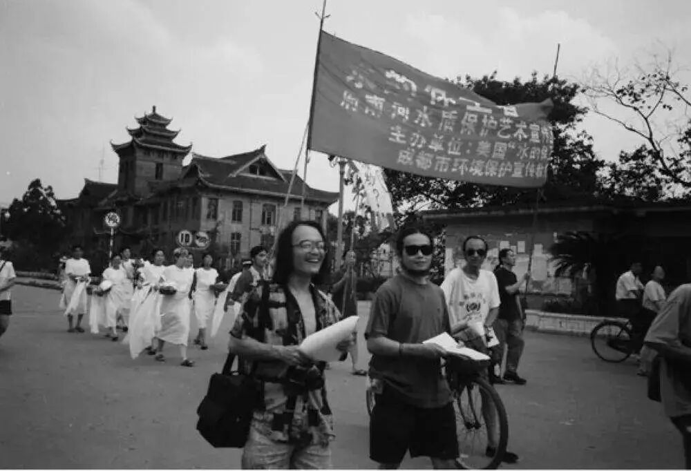 1995年8月,艺术家高举“水的保护者”大幅宣传标语,昂首阔步地行走在府南河两岸大街上 图源网络