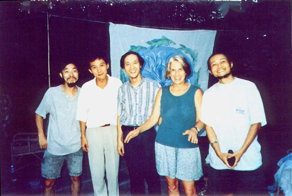 1995年府南河《水的保护者》活动策划人达蒙女士与参展艺术家留影,右起:戴光郁、达蒙、李继祥、朱晓峰、朱罡。图源网络