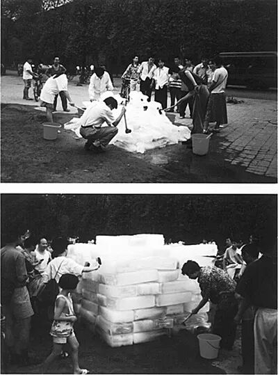 1995年,中国当代重要的女性艺术家尹秀珍在成都府南河创作了一件行为艺术作品《洗河》。她在府南河中抽取了约十立方米的河水,将其制作成冰块,然后再将冰块运回到河边以清水进行洗刷,并邀请过路的行人参与其中。