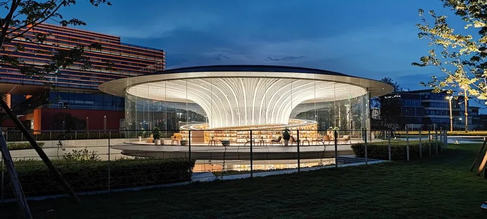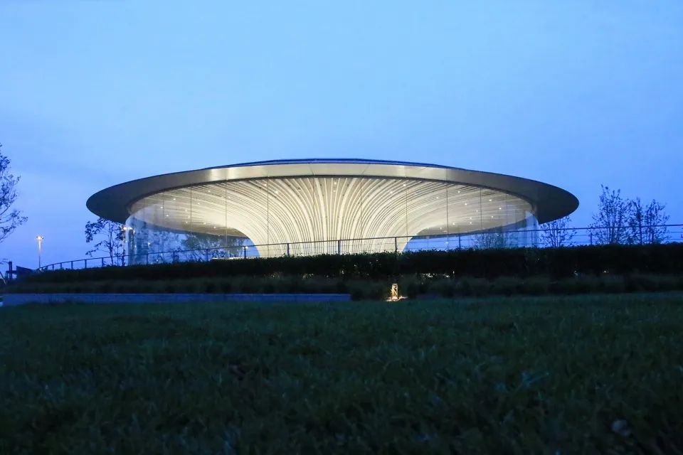 建筑采用了伞型支撑的张弦梁空间钢结构体系,优美的伞型结构无需任何装饰,自然地展现出轻盈漂浮的建筑美感。40根直径180mm的弧形钢结构圆管,围绕圆形中庭展开,独特的结构形式成就了一个360度的环形无柱空间。