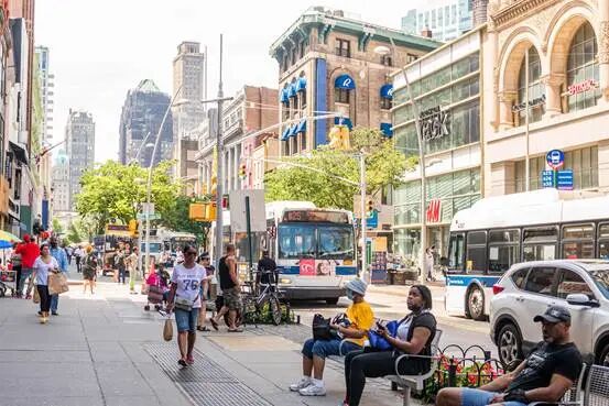比如位于布鲁克林的 Fulton Street,设置了有趣的橙色圆柱形售货亭、半圆形长椅和特色的富尔顿拱廊,形成了一定的有吸引力的城市目的地。
