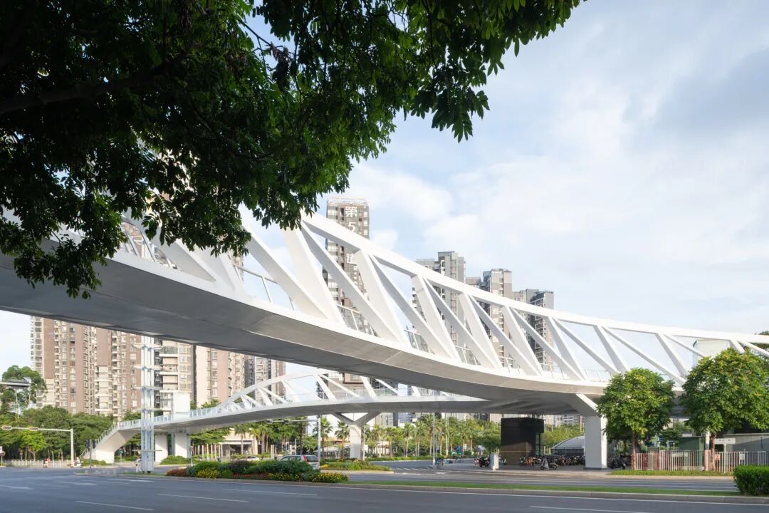 深圳宝安滨海廊桥位于深圳市宝安中心区核心地带,是宝安区委、区政府完善慢行系统、缝合城市空间的重要民生工程。宝安中心区的定位是城市中央活力区和科技创新服务区,在前海扩容后具有了更加重要的区域性战略地位。项目全长约 2 公里,北起宝安体育场,东联宝安图书馆,南至滨海文化公园,遥望前海湾。廊桥跨越 9 个城市地块、6 条城市主干道,穿越核心商务区绿带,生态链接宝安体育场、图书馆、核心商务区、“湾区之声”演艺中心、滨海文化公园等城市重要节点,进一步增强中心城区通达性,是串联城市能量与滨水活力的重要纽带。
