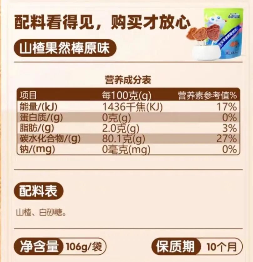洞悉家长担忧的小鹿蓝蓝,没有走“成人零食儿童化”的捷径,而是在配方上做减法,对于产品成分和配料进行严格限制,不添加甜味剂、防腐剂、人工香精等添加剂。比如天猫旗舰店的“销冠”山楂棒棒糖,配料表里只有山楂和白砂糖两种配料。