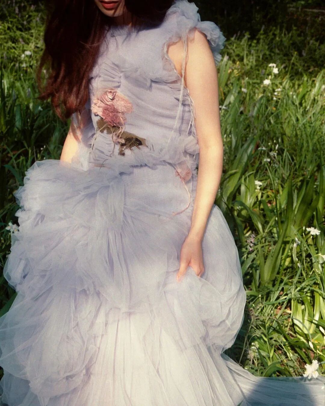 手工制作的面料、印象派油画的质感与浓郁的色彩相互映衬,一个个身着Caroline Hu穿梭在画框中的少女仿佛在作品中走出,又美丽又仙气。