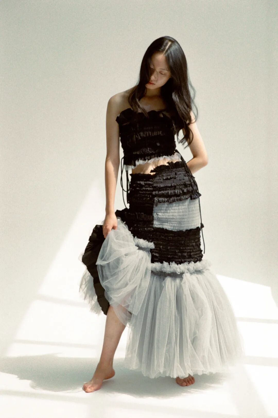 Caroline Hu(胡颖琪)出生于深圳,本科就读于中央圣马丁(Central Saint Martins),后又在美国帕森斯(Parsons)获得硕士学位。她手中那针织与薄纱的碰撞让服装被赋予浪漫主义的色彩。