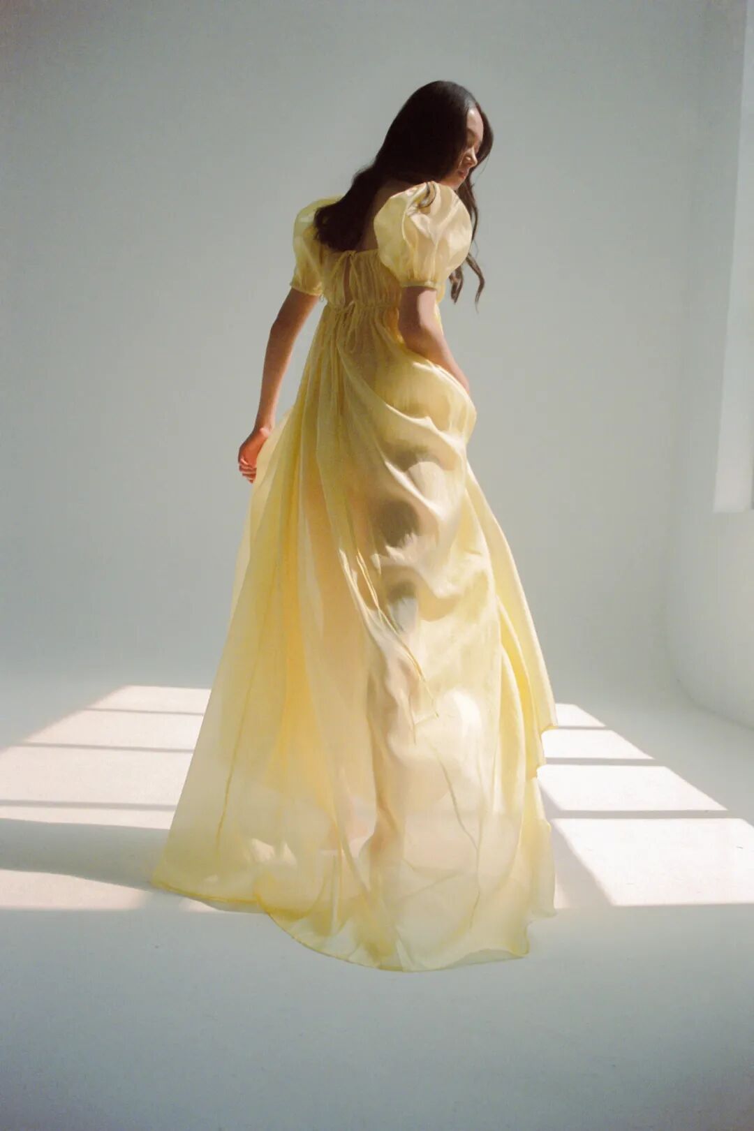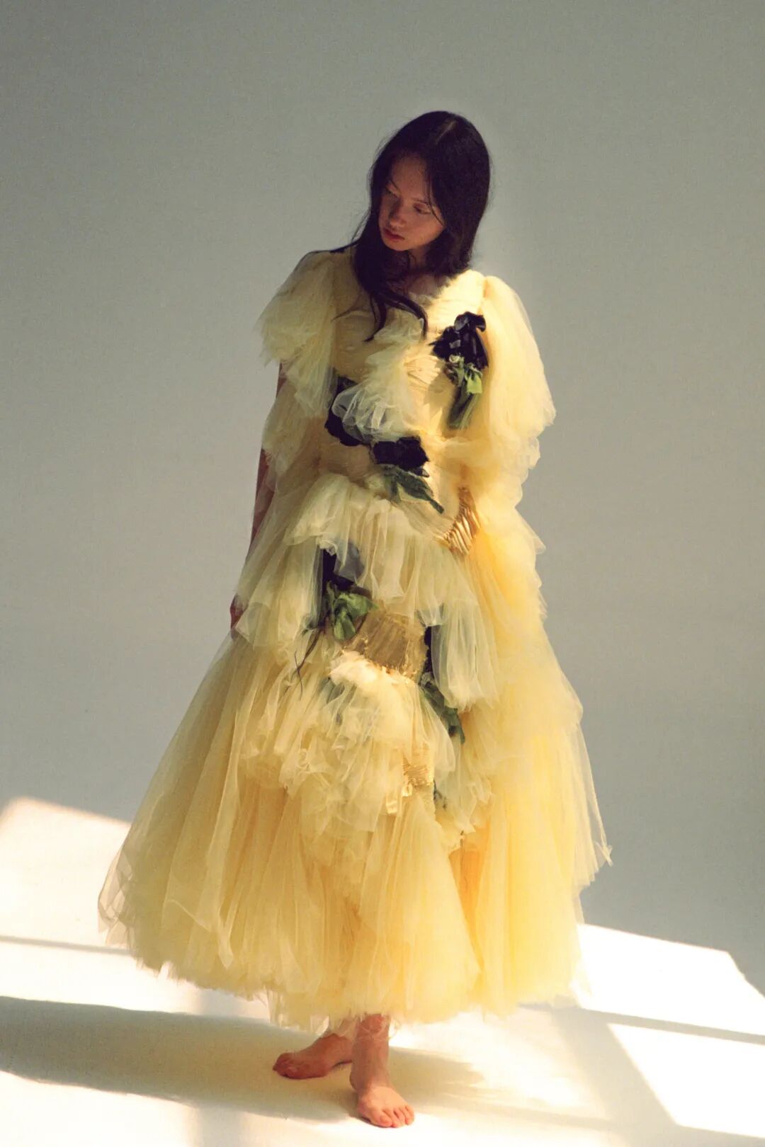 Caroline Hu将轻薄的丝绸通过堆褶、分割等处理方式,制作成裙子,穿着在热爱芭蕾的少女身上。鹅蛋黄色之中通过穿插变化出的色彩,像一个闪着珠光的小泡芙,拥有着可塑性的面料让什么体型的女孩都可以穿它。