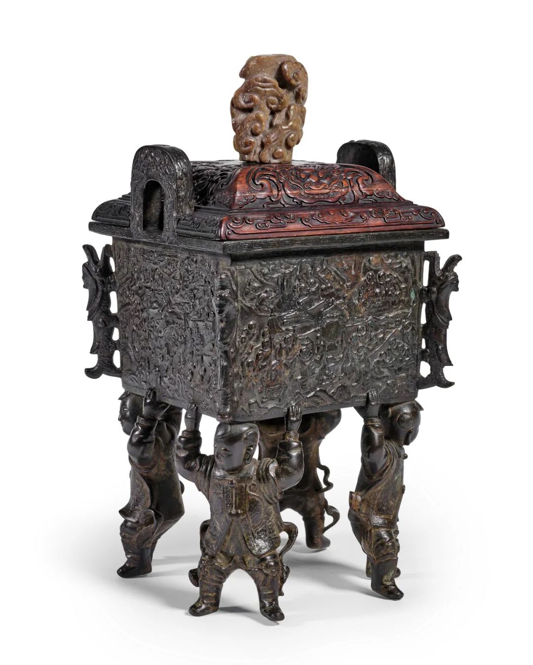 香事在“古代文青”雅集中更是不可或缺,常为经验丰富的童子所侍奉。此件铜百子图方炉,腹壁所饰百子图錾刻精细,人物众多,活动繁多,画面密不透风,而灵活有致。百子所玩游戏可考者有曲水流觞、琴棋书画、百戏、折桂、蹴鞠、会审、钓鱼、奏乐、礼佛、状元游街等等。此类儿童所玩游戏皆模仿成人,充满成人对子嗣的美好期求。