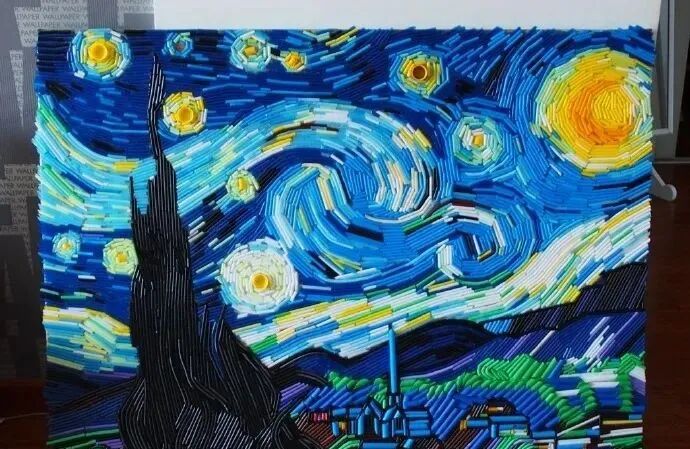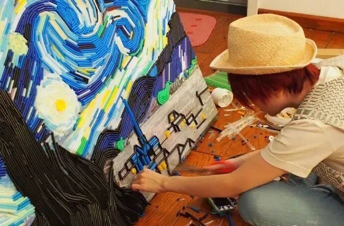 一次,在学习画梵高的《星空》时,她突发奇想,创作了一幅吸管和瓶盖的拼贴版。