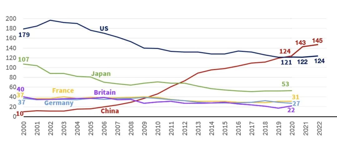 中美两国企业占全球500强企业二分之一以上。中国达到136家,加上台湾地区企业,中国共有145家公司上榜,大公司数量继续位居各国之首。