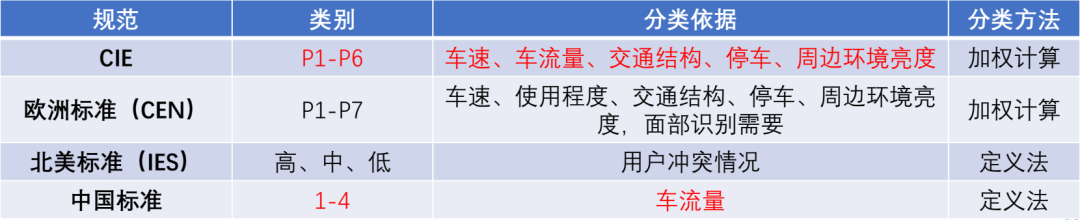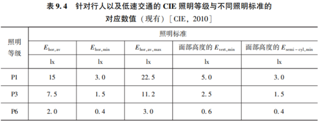3.行人及低速交通:为了能够根据这些因素来确定适合的照明等级, CIE 提供了针对所有这些因 素的不同权重值 Vw。表 9. 5 中列出了这些权重值的一部分。所有权重值的总和 Vws决定了该交通环境的照明等级数, 计算方法为 P = 6 - Vws