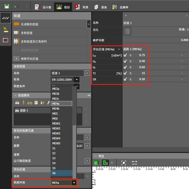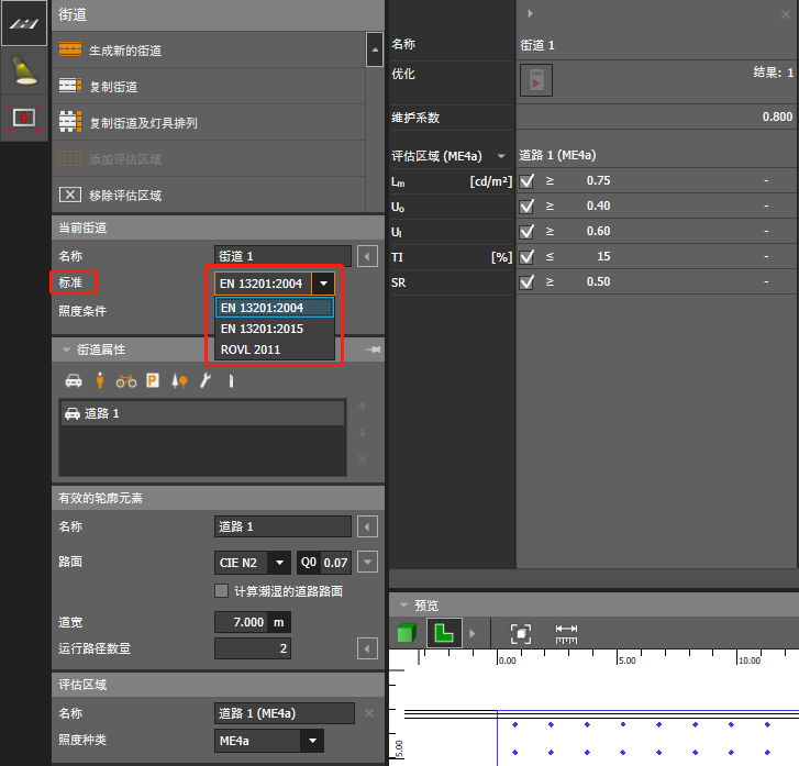 由于国内道路照明设计标准和国外道路照明设计标准存在差异,在计算时需要合理选择计算标准,建议采用EN13201:2004(照明评价标准与CJJ45-2015《城市道路照明设计标准》可基本对应,只是标准值不完全对应),另外两个是欧洲标准,这里就不展开了。