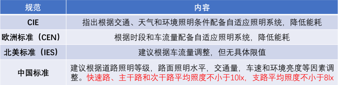 5.自适应照明:CIE 的建议明确地指出, 自适应照明能够自主适应暂时变化的环境, 例如交通、天气以及环境照明条件,因此自适应照明具有大幅降低能耗的可能性。如果照明设施被设计为能够真正尽可能地适应 (调光) 环境照明水平的大幅降低。值得注意的是,在这种环境下,只允许适当降低照明水平而不能降低均匀度。