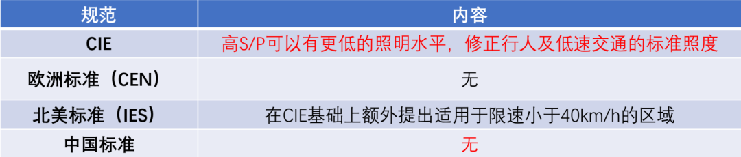 4.光线的光谱:基于中间视觉中给出的中间视觉修正系数,允许高S/P比值的光谱环境下有更低的照明水平。然而,在同一份报告中还提到,只有在光源的显色系数R大于60的情况下,才能允许使用低照明水平。如果用S/P比值为0.6的高压钠灯作为未修正灯具的参照,则对Pl-P6的各个等级中所有S/P比值更高(也就是色温更冷)的灯具都能有更低的平均水平照度。