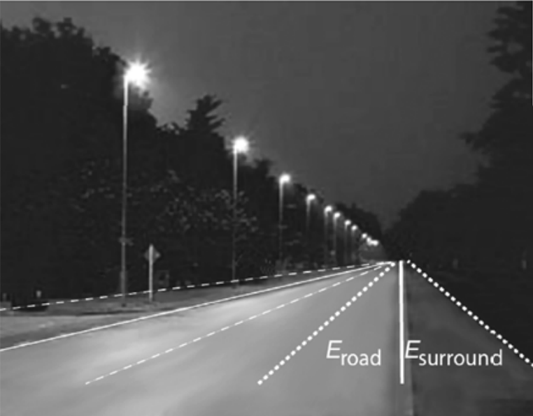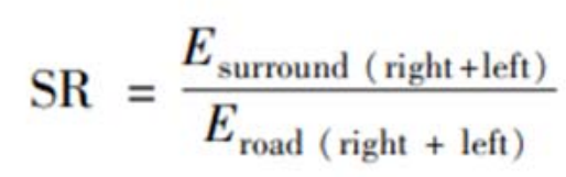 3.周边环境比:为了能够保证光线在路沿位置上不会太快截止,引入了周边环境比(SR)这一照明质量参数。它的定义是:离道路左右两边5m处的道路相邻区域的平均水平照度与离道路左右两边5m处的道路自身区域的平均水平照度的比值。