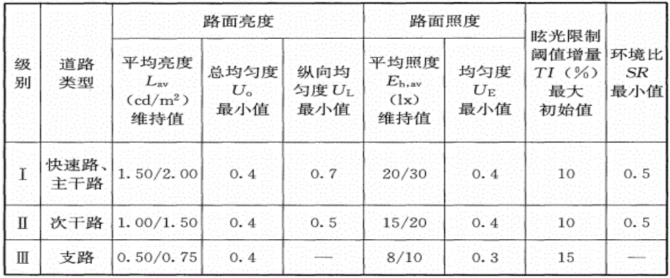 3.表中对每一级道路的平均亮度和平均照度给出了两档标准值,“/”的左侧为低档值,右侧为高档值。