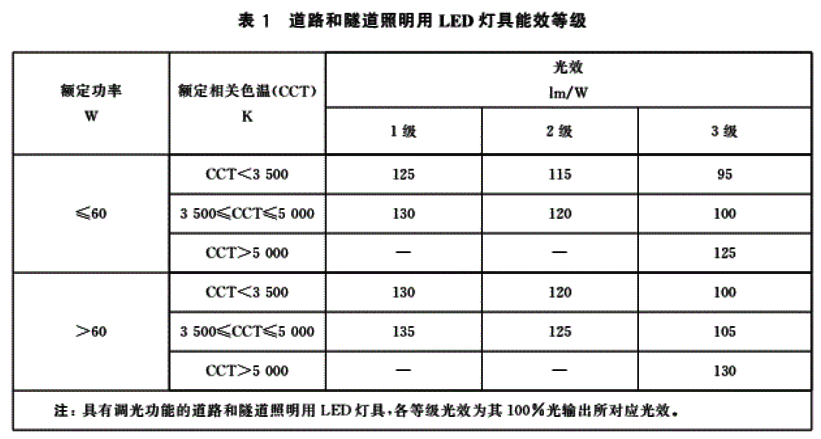 GB 37478-2019 《道路和隧道照明用LED灯具能效限定值及能效等级》中将道路和隧道照明用LED灯具能效等级分为3级,各等级道路和隧道照明用LED灯具光效不应低于表1规定。