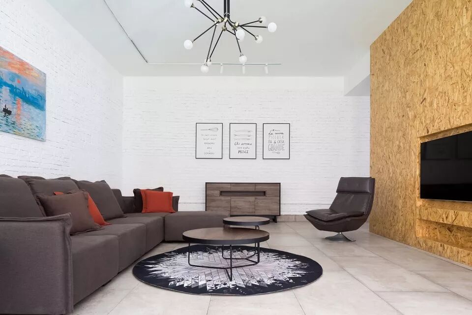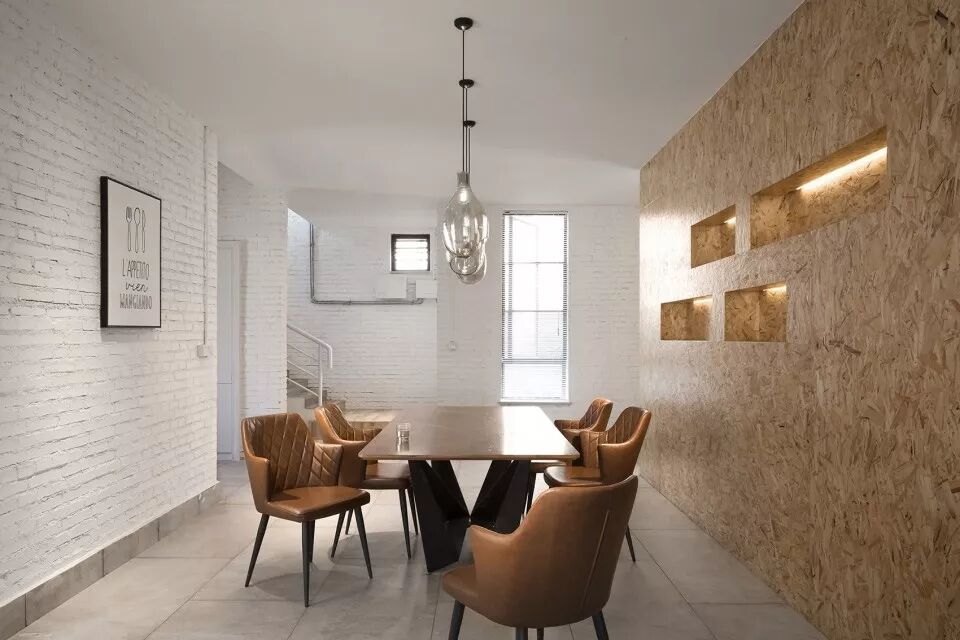 清水砖墙既是主体结构又是粗犷豪放的内装饰面,性价比优越。简洁利落的线条将各功能区有序分割,容纳更丰富的现代家庭生活。整墙欧松板既是背景结构也形成空间界面,与仿混凝土地砖和明装线管相互映衬,以温暖的纹理平衡着硬朗的工业基调。