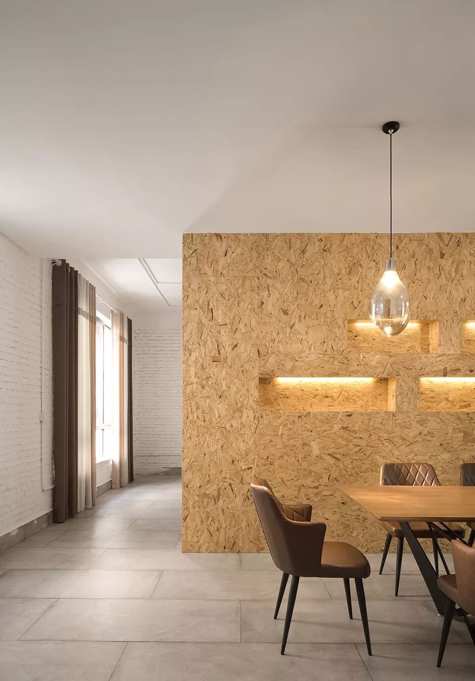 ▼餐厅细节,整墙欧松板不仅是背景结构,也划分了餐厅和起居室